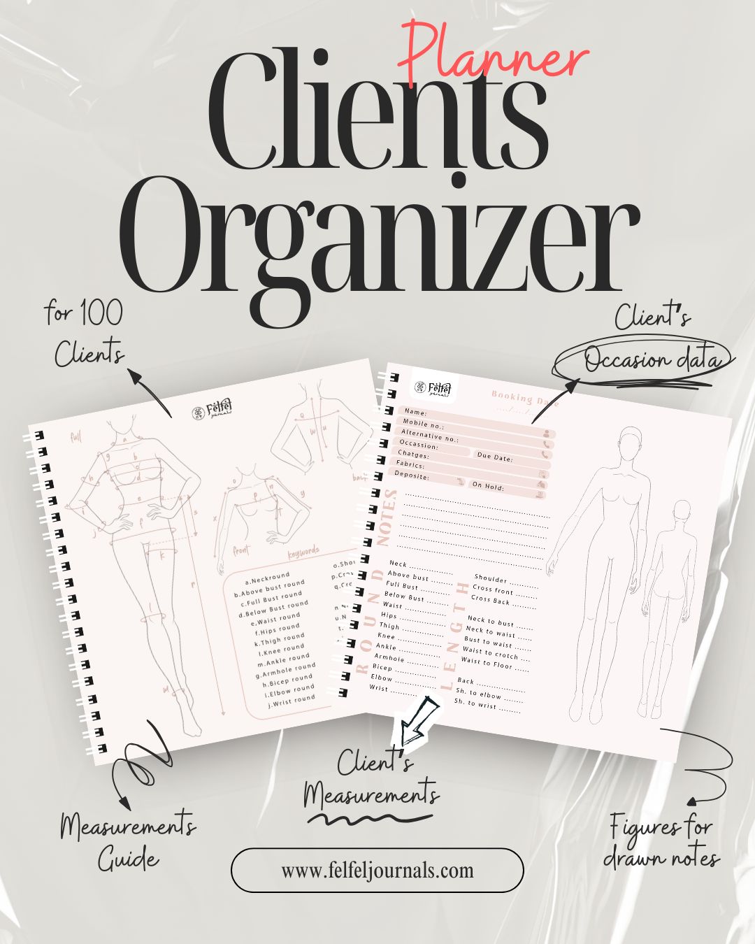 Content: all your clients data and measurements, plus front and back figure template for any details and needs.